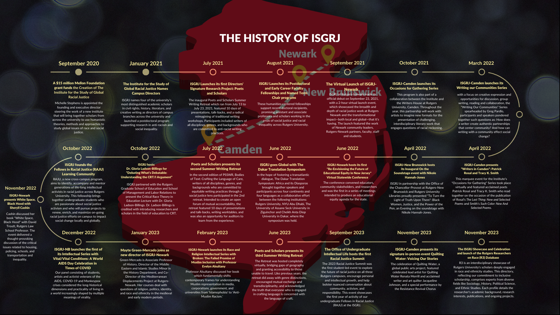 A similar thank you to ALL the faculty who have signed on to mentor ISGRJ postdocs, early career faculty fellows, and our named term chairs. And of course, the biggest shout out and thank you to my ISGRJ team of faculty and staff. Our administrative team in particular exemplifies some of the most committed program directors, administrators, and federal work study students I have had the pleasure of working with at Rutgers. Their daily efforts to provide exemplary service to their campus branches, as well as across all the Chancellor-led units university-wide, are impressive. You are all the most awesome humans to work with — and all together we are delighted to share this second update of our activities and invite all in the Rutgers community to join our research conversations regarding this challenging issue of race.
